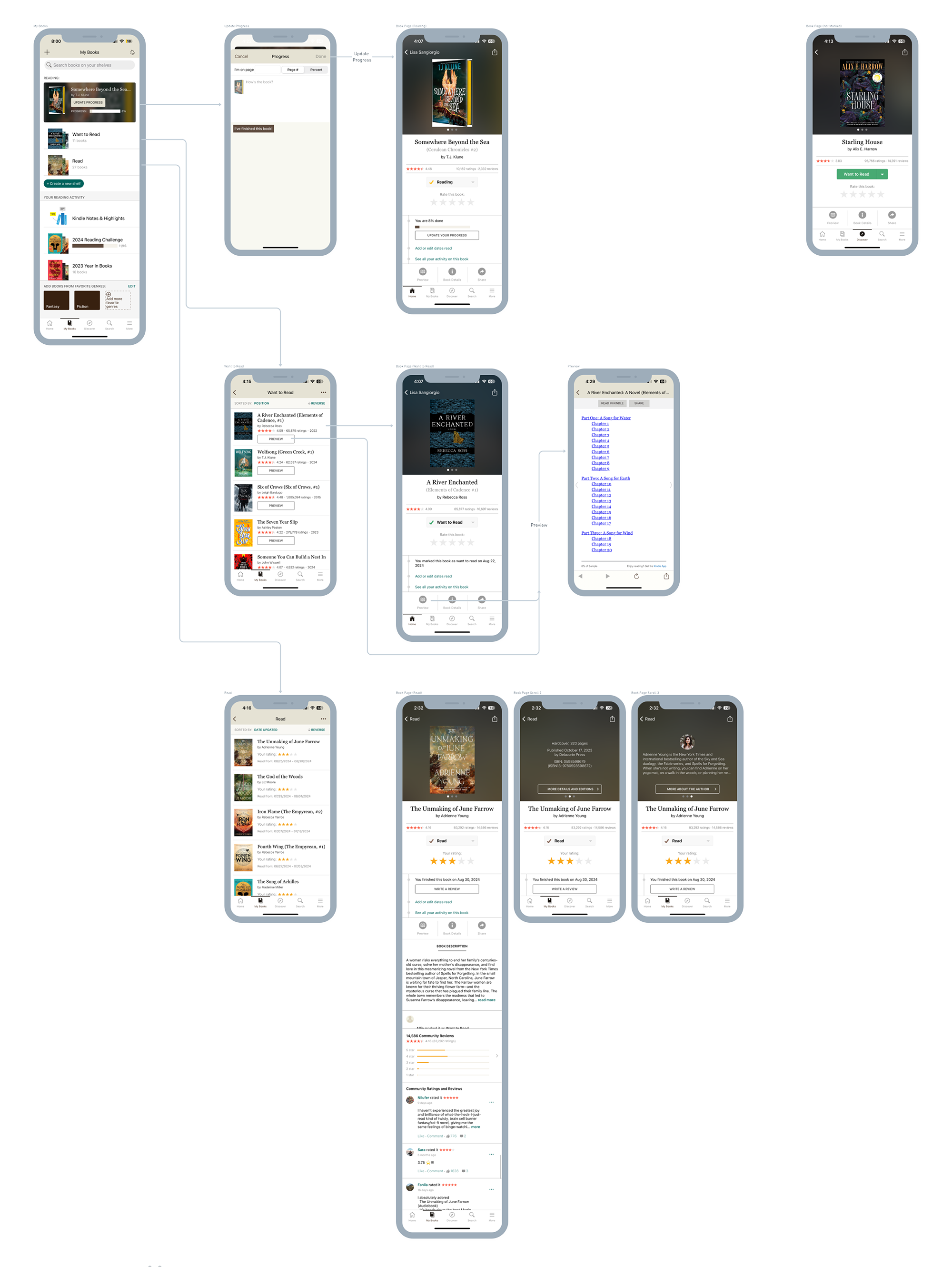 A full audit of the existing platform was necessary in order to get a full understanding of Goodreads’ features, capabilities, and UI choices. I created and categorized a feature list and a screen flow. This information helped me understand feature organization while also cluing me into potential improvements (such as navigational redundancies). This is also where I start to notice opportunities in the framework to improve the existing features (such as kindle integration).