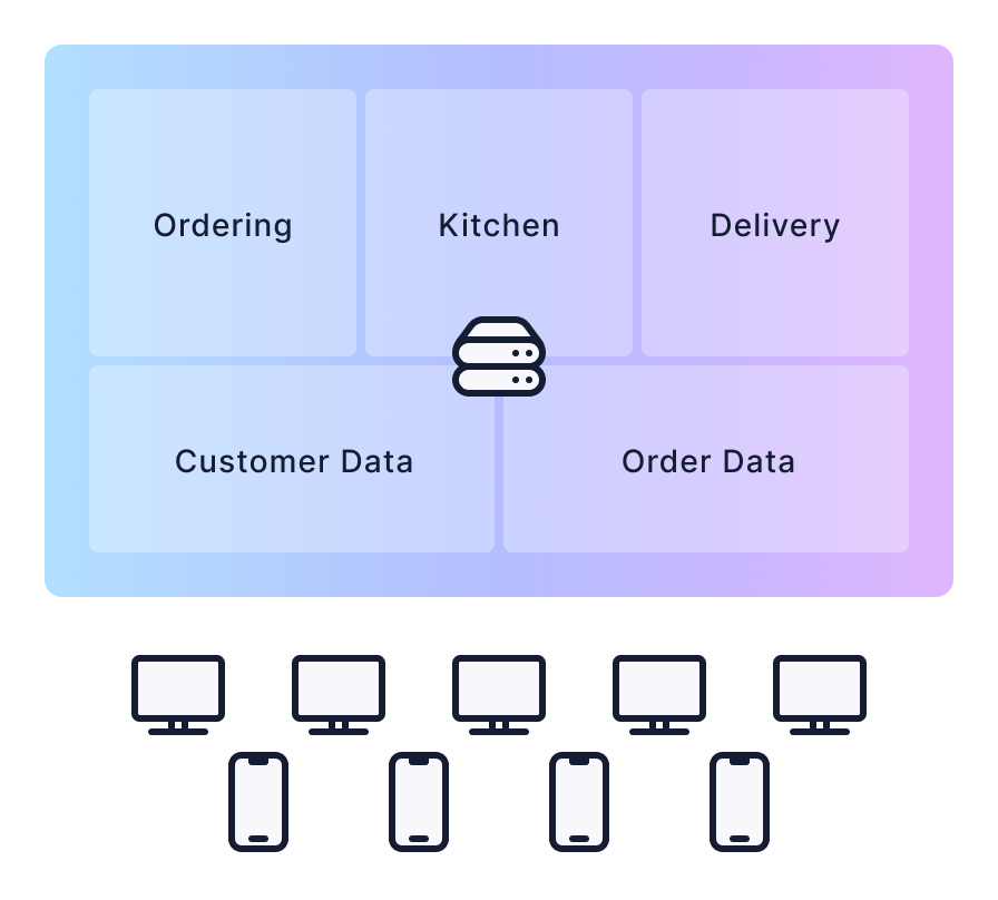 In a traditional architecture, orders are passed between multiple disparate systems which are unaware of each other beyond limited integration points. Data is held in siloed databases and unable to inform decisions in other areas of the system. One part of the system is unable to control another part of the system for the benefit of the whole.