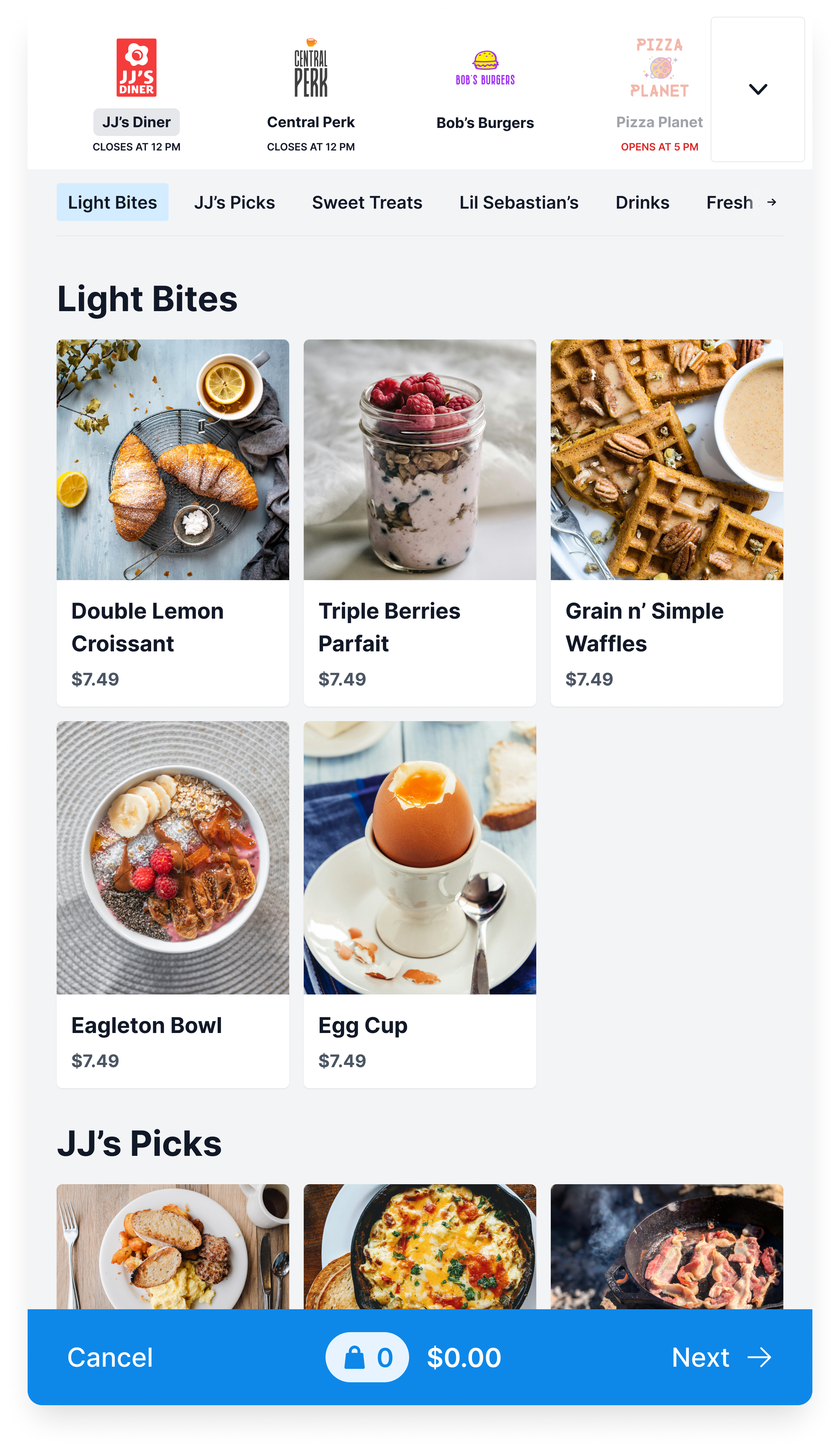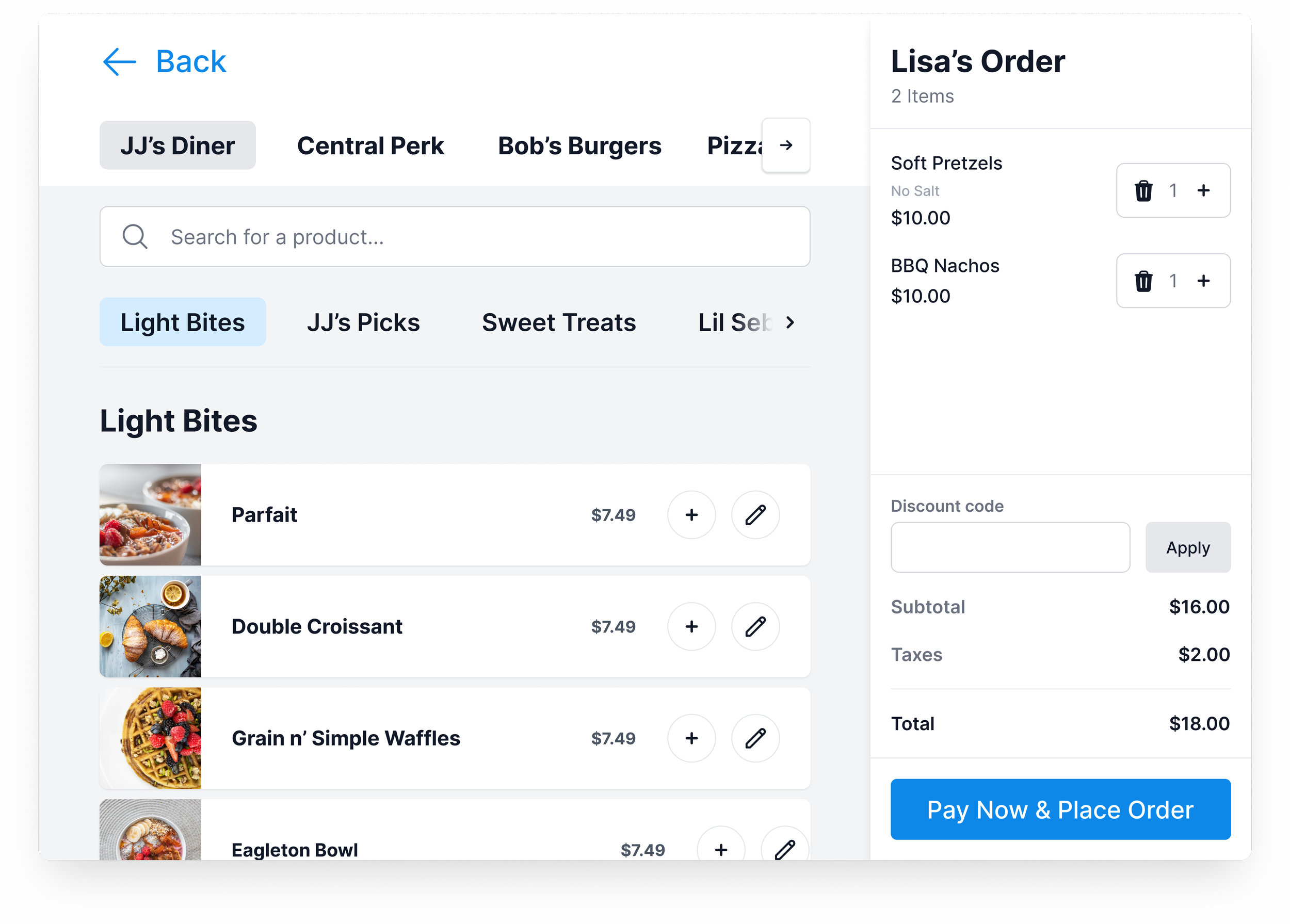 The ordering kiosk is an in-store experience that allows the customer to view the menu and place an order in store for pickup. It is congruous with the online ordering experience, but is simpler and includes payment processing.